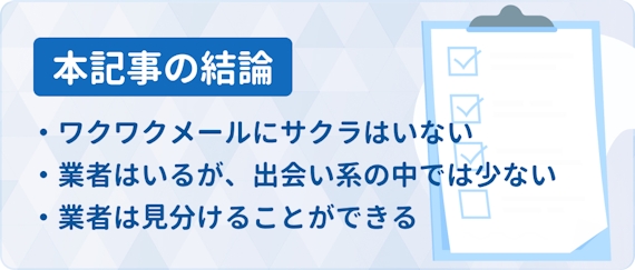 結論:ワクワクメールにサクラはいない&業者も少ない