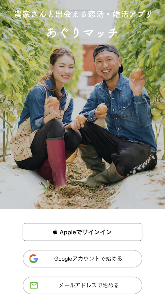 あぐりマッチは男女ともに登録無料なので、まずはアプリをダウンロードして会員登録してみましょう。登録方法は以下の3通りなので、お好みの方法を選んでください。